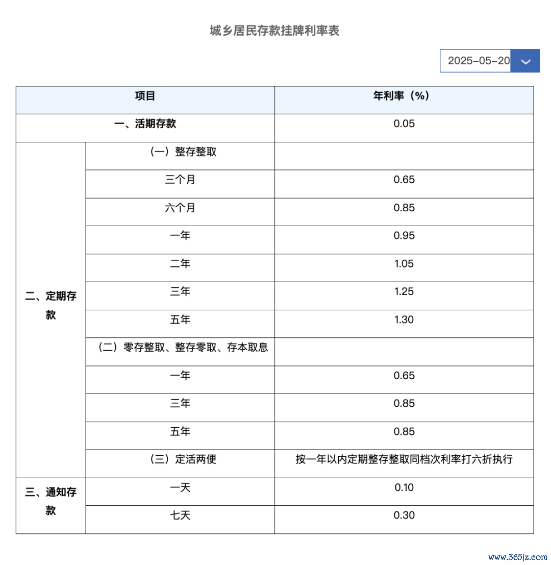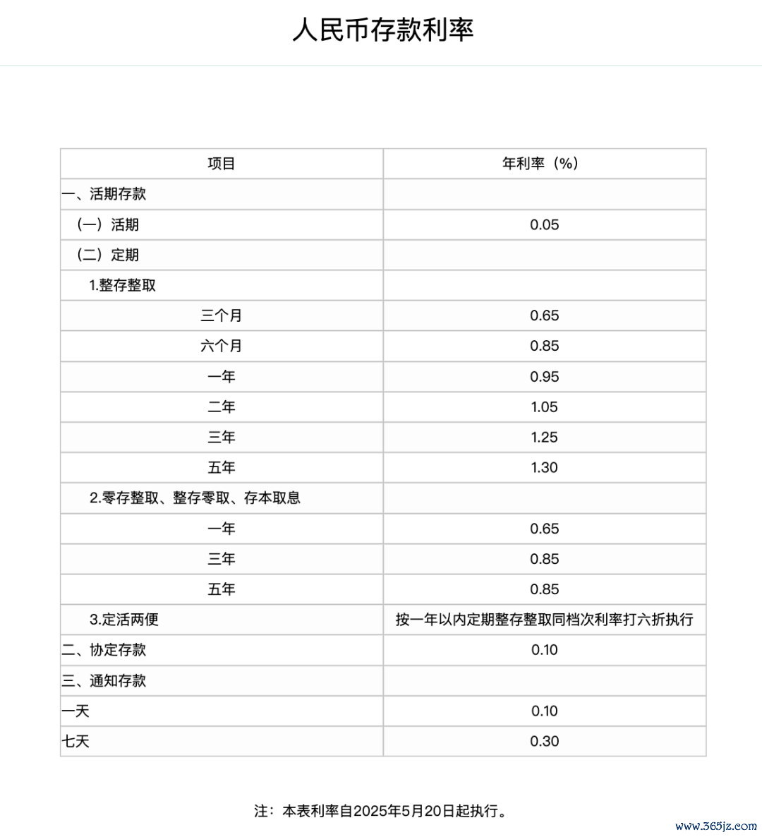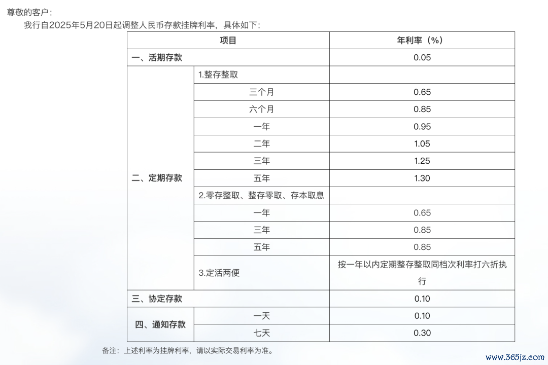 定期存款整存整取三年期和五年期利率下调25个基点,调整后的存款利率分别为1.25%和1.30%;