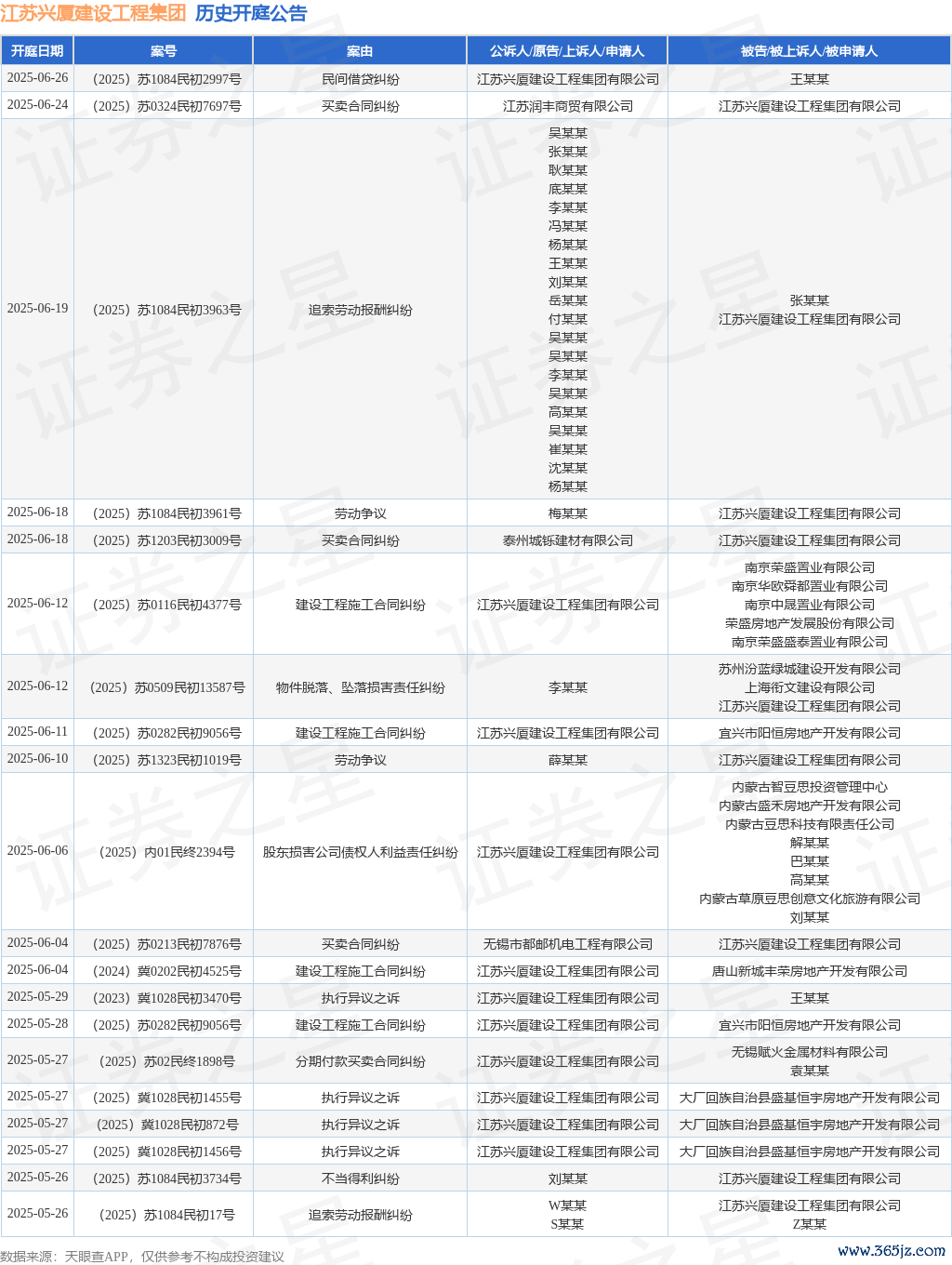 案号:(2025)内01民终2394号审理法院:内蒙古自治区呼和浩特市中级人民法院案由:股东损害公司债权人利益责任纠纷当事人信息: 原告/上诉人:江苏兴厦建设工程集团有限公司 被告/被上诉人:内蒙古智豆思投资管理中心、内蒙古盛禾房地产开发有限公司、内蒙古豆思科技有限责任公司、解某某、巴某某、高某某、内蒙古草原豆思创意文化旅游有限公司、刘某某开庭日期:2025年6月6日根据统计,近一年内以江苏兴厦建设工程集团有限公司为当事人的历史开庭公告有239则,其中案由为“建设工程施工合同纠纷”的公告以40则居首,其次为“建设工程分包合同纠纷”有22则,“买卖合同纠纷”有22则。历史开庭公告(前20条)如下: